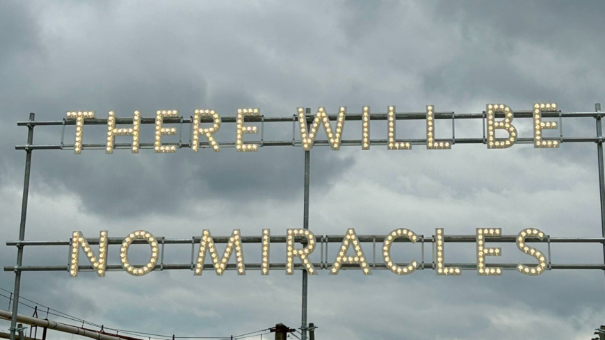 Intrigués, nous quittons cette première halle, dense et hébergeant de belles découvertes sur lesquelles nous allons revenir ; et suivons le chemin indiqué en faisant crisser les gravillons. Quelques dizaines de mètres nous séparent de cette seconde halle, plus petite, plus basse de plafond aussi. Nous passons sous l’arche “Burn the village” (une œuvre signée Nathan Coley) qui squattera bientôt beaucoup de murs de réseaux sociaux, puis l’espace dédié à la street food, le bar et la boutique curatée par le concept-store Blitz, avant de se faufiler derrière un grand rideau de velours noir. Ce trajet coloré et bruyant participe de l’expérience : car nous voilà soudain catapultés dans un monde à l’opposé de celui que l’on vient de quitter. Plongés dans le noir, cherchant nos repères.