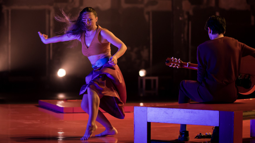 Elle dialogue ici dans un duo musical avec Rafael Riqueni, qui compose et interprète sur scène toutes les musiques originales — il est considéré comme l’un des plus grands de l’histoire du flamenco.