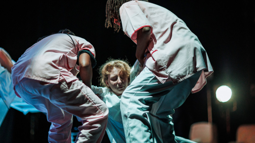 La pièce se déploie dans une scénographie mobile qui assure la fluidité du voyage au cœur de l’expérience de la maladie.