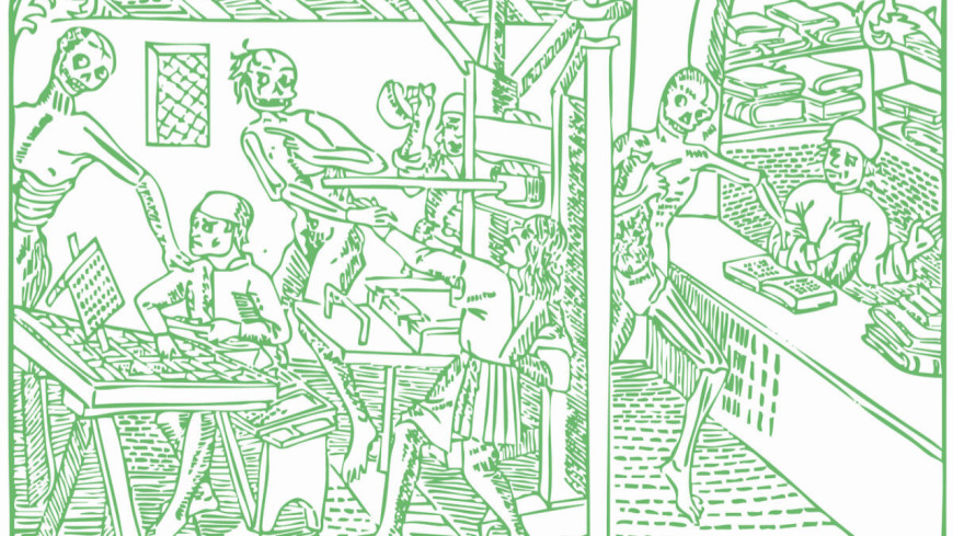 Une référence à l’imprimerie lyonnaise accompagne également cette composition, avec des extraits de la Grant danse macabre des hommes et des femmes.