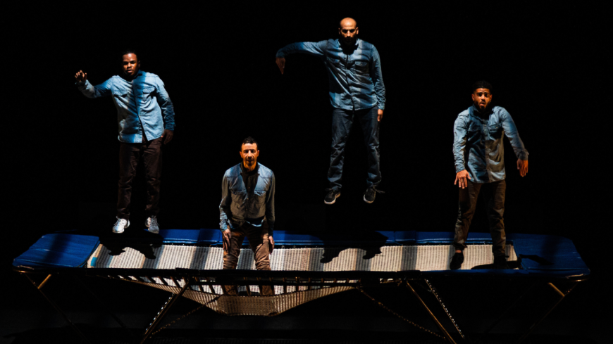 Sur scène : cinq danseurs entourés d’une scénographie mêlant trampolines, cartons et ombres chinoises.