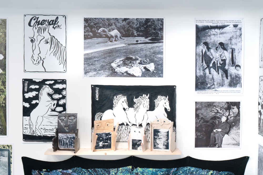À KOMMET, elle assemble photographies, fac-similés, textiles, céramiques, archives et dessins en une suite de chapitres visuels : signalétique des sites, appropriation des grottes par visiteurs et intellectuels, gestes du toucher, silhouettes animales, rituels ou encore boutique souvenir. L’ensemble rappelle une chambre d’adolescent saturée d’images, comme une grotte contemporaine où elle redessine notamment des chevaux inspirés de Cheval Star. Une série de stèles en céramique, gravées de mains issues des émoticônes, questionne la continuité entre gestes préhistoriques et langages numériques.